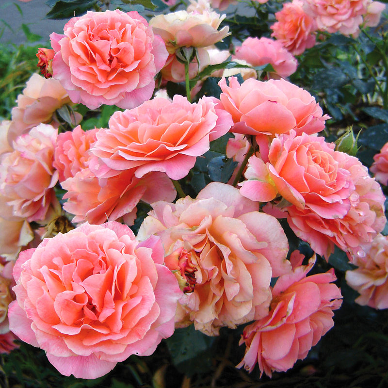 Bordure Abricot (Delbard, 2008) Описание сорта: Густой, невысокий, обильно цветущий коралловыми цветами хорошо нарастающий округлый куст. Бутон медно-оранжевый, яйцевидный. Цветок абрикосово-оранжевый с желтым центром, в полном распуске становится коралловым . Чашевидный до розетковидной формы , махровый, 17 — 25 лепестков в одном цветке, диаметр цветка 4 — 6 см, с легким ароматом. Цветение очень обильное, непрерывное, до поздней осени, цветки собраны в крупные соцветия, на одном цветоносе в период массового цветения по 5 — 8 цветков одновременно. Куст очень компактный, с прямостоячими побегами, высота растения 50 — 70 см, ширина 60 см, лист темно-зеленый, крупный, глянцевый. Цветение с начала сезона до заморозков. Устойчивость к заболеваниям очень высокая, посадка на солнечных местах. Морозостойкость до -20. Почему именно роза Bordure Abricot: Цветение очень обильное Высокая устойчивость к болезням