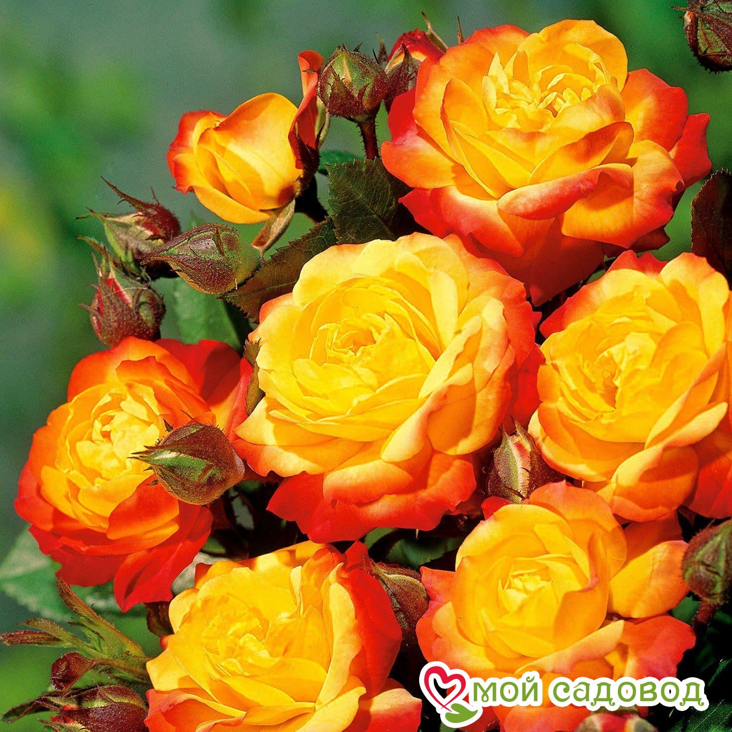 Куст компактный и густой, достигающий в высоту 40-60 см и в ширину 50 см. На крепких побегах формируются среднего размера, насыщенного зеленого цвета листики с глянцевой поверхностью. Облиственность у растения довольно сильная. Однако несмотря на это, в период активного цветения кусты почти полностью покрыты соцветиями, за счет чего практически не видно листву. Желто-оранжевые с малиновыми полосами бутоны имеют овальную, заостренную форму. По мере распускания цветка окрас лепестков становится более желтым с красно-оранжевыми краями. Форма цветка – от чашевидной до розетковидной. Оттенки плавно переходят один в другой. Цветки махровые, диаметром 4-6 см, в каждом от 25 до 45 лепестков. На одном стебле образуется 5-10 цветков, собранных в соцветия, покрывающие весь куст. Сорт обладает слабым ароматом, но очень приятным, с легкими пряными нотками чайного дерева и масла иланг-иланга. Хранение до посадки Как хранить растения, если вы получили посылку раньше начала посадочного сезона? Для хранения саженцев роз есть несколько простых правил: Если роза спит — храним в холодильнике или подвале при температуре от 0 до +4 °С, или на улице в коробке под толстым слоем снега. Если роза проснулась — прикопать в теплице или высадить в сад, обеспечив укрытие. Можно посадить розу в горшок и хранить в прохладном подвале или на балконе/лоджии, притеняя от прямых солнечных лучей. Во время хранения периодически проверяйте состояние посадочного материала. Поврежденные, загнившие части корней удалите и обработайте фунгицидом (Топаз, Фитоспорин).